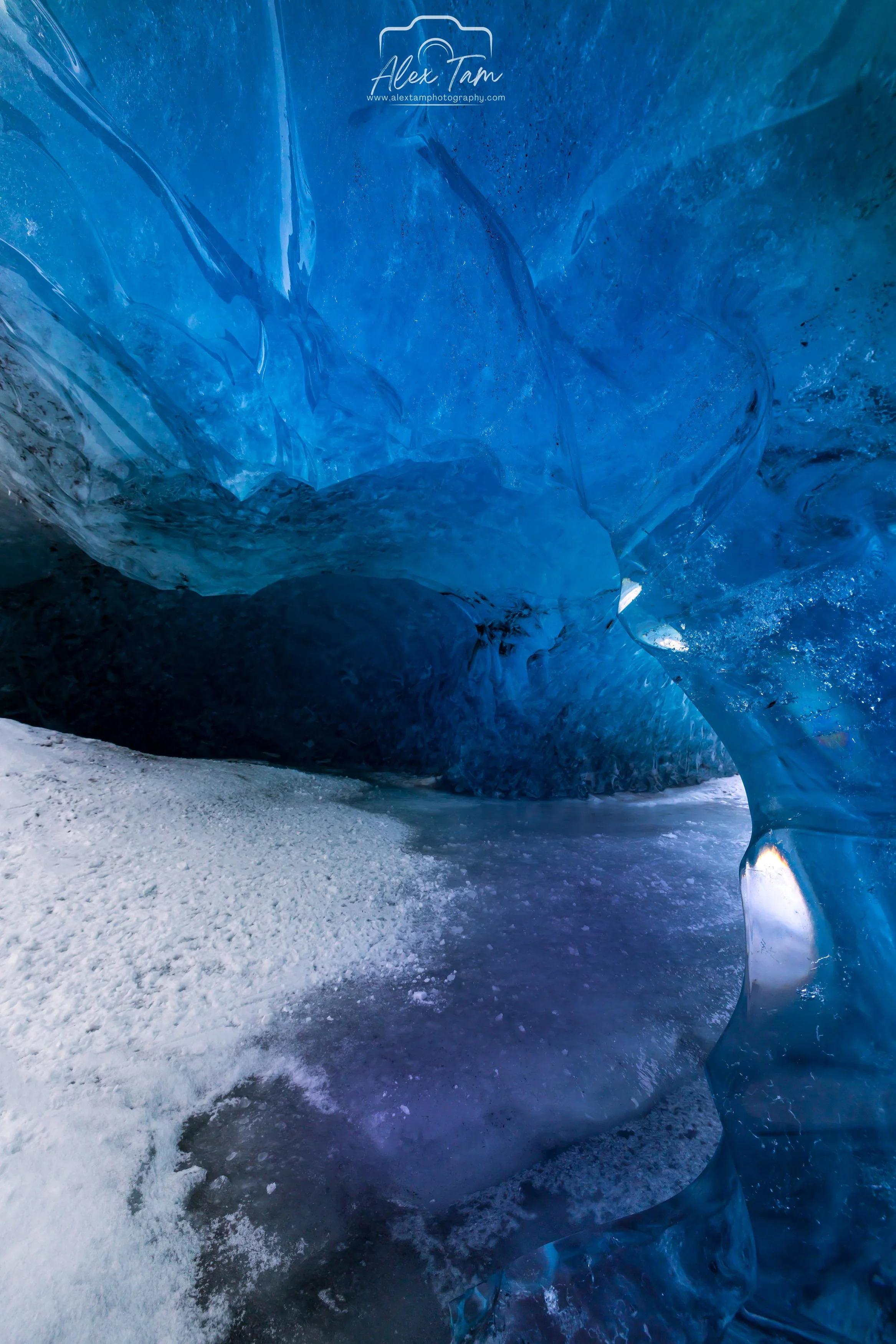 Light needs to be able to get through the newer ice and snow on the surface of the glacier for the ice that forms the ice cave to appear blue.