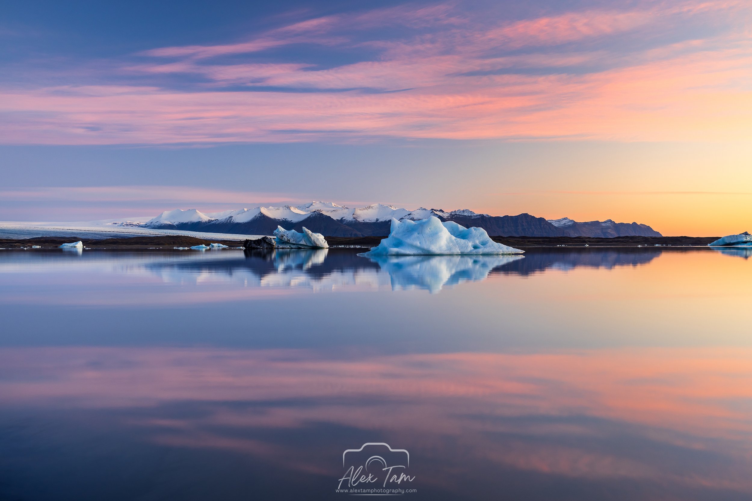 In the early morning, the lagoon often has a calm, mirror-like surface that perfectly reflects the icebergs and surrounding landscapes.