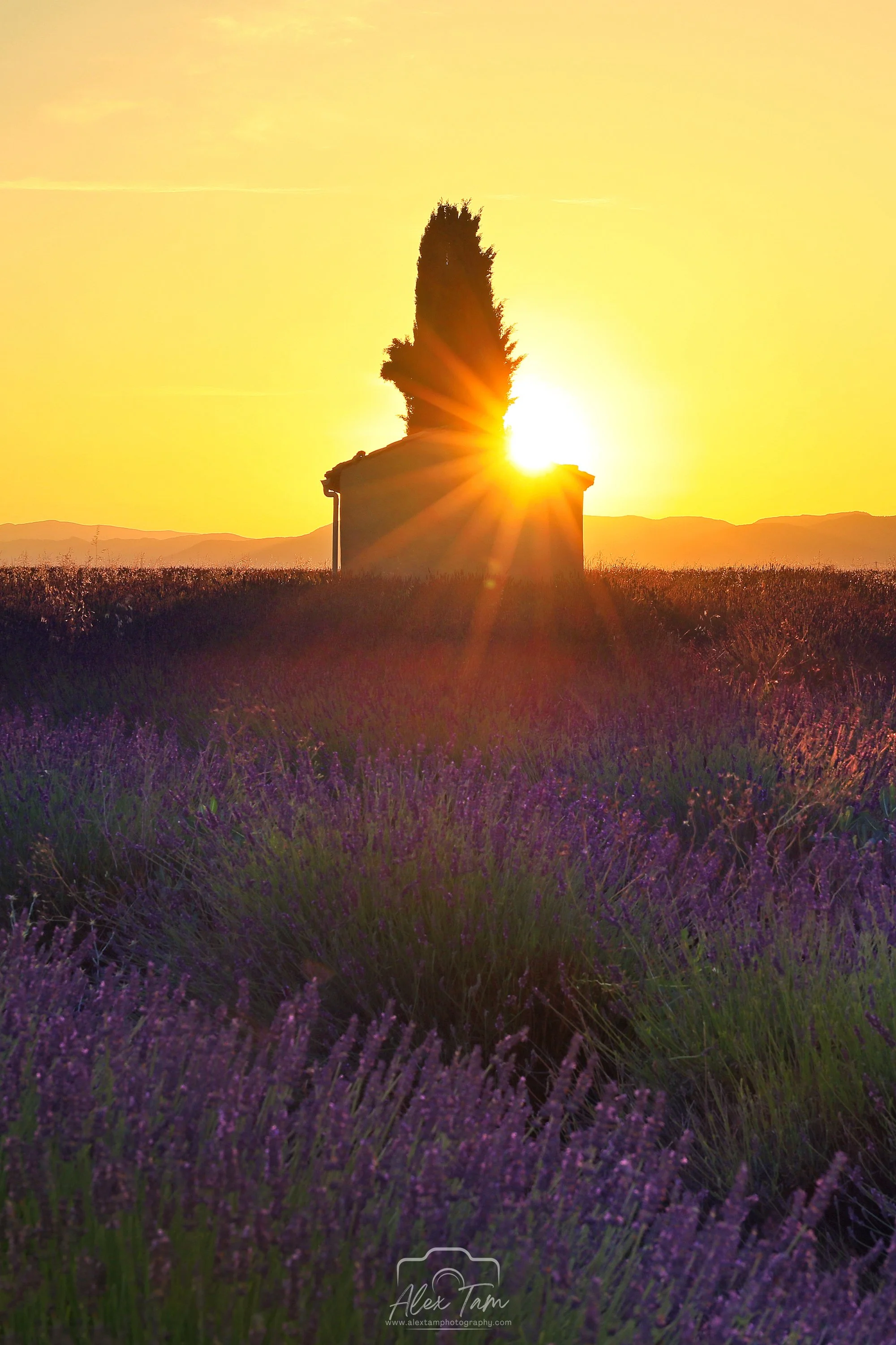 During sunset, the little hut and small tree create a stunning silhouette against the lavender field, as the sky transforms into a canvas of warm oranges and soft purples.